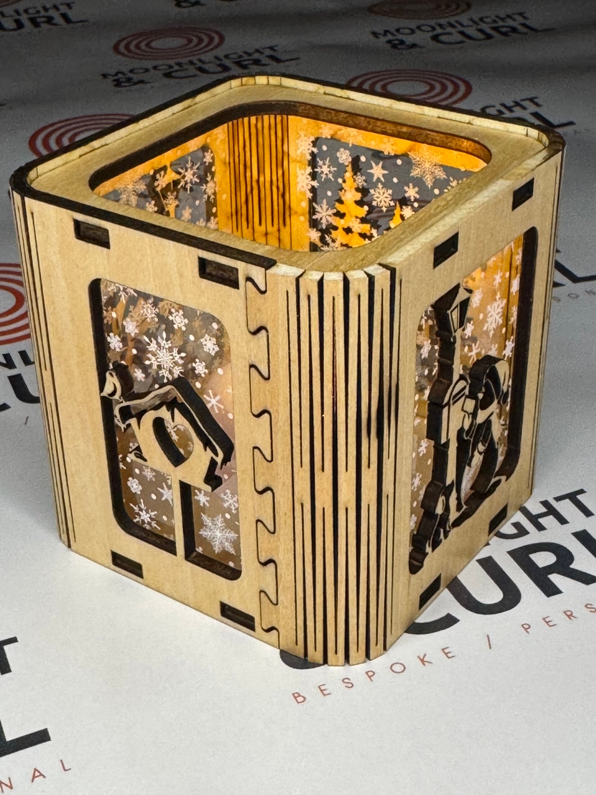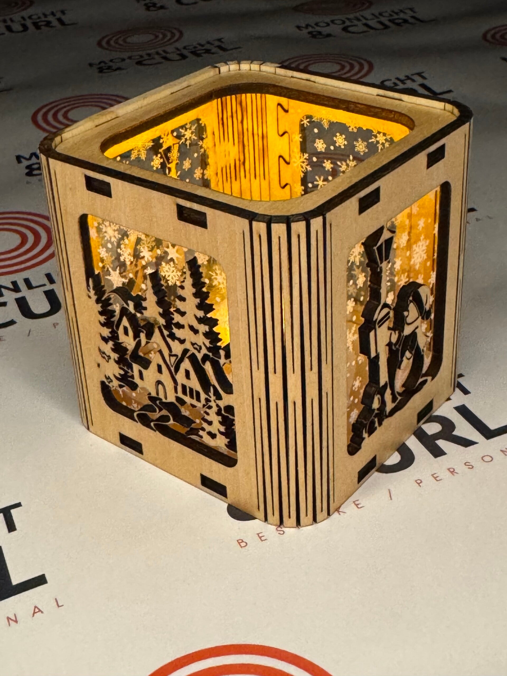 Snowy window wooden lanterns for faux candles, varying designs. Comes supplied with a faux candle. Battery-operated, flickering effect. Choose wood colour, natural, gold or white.